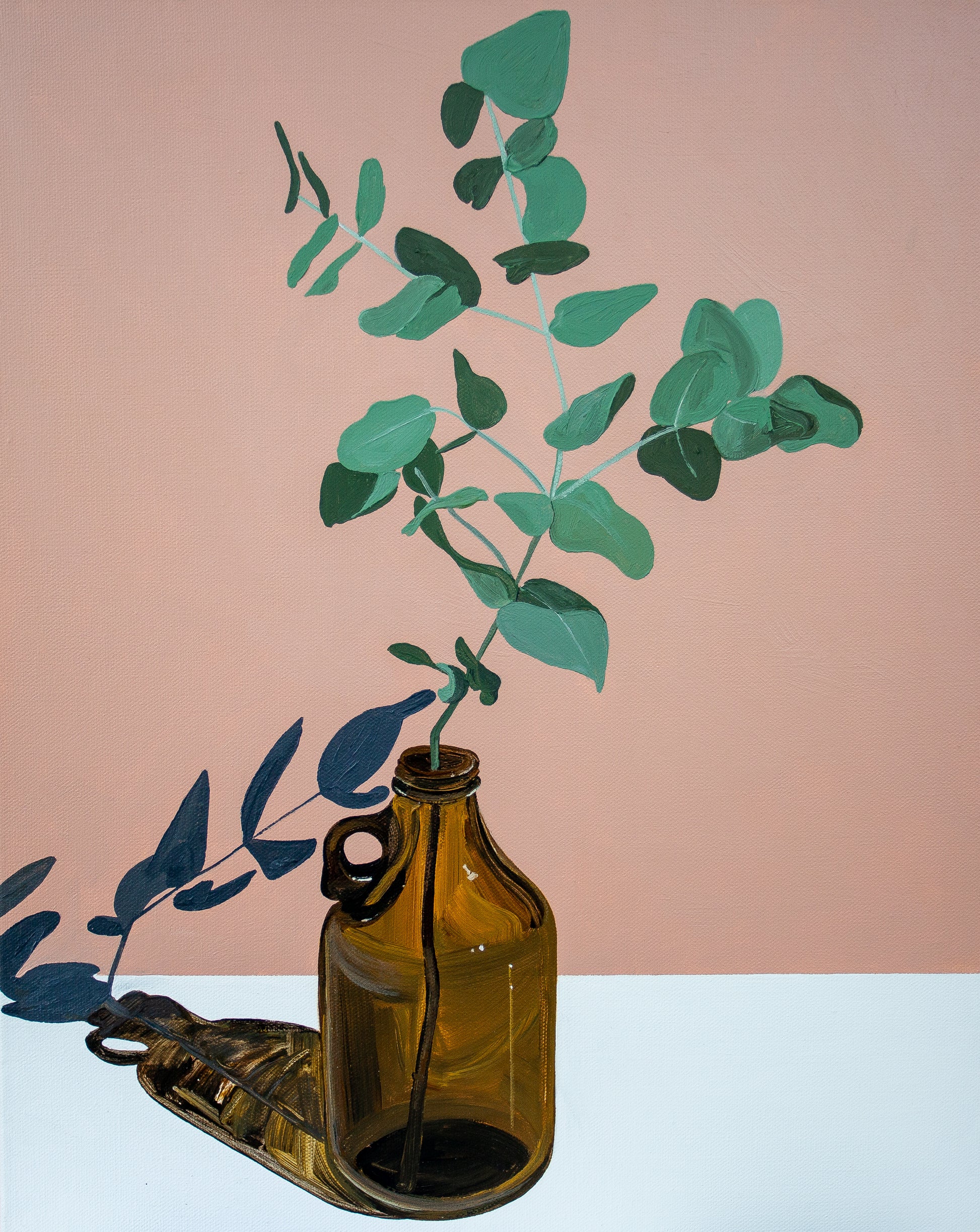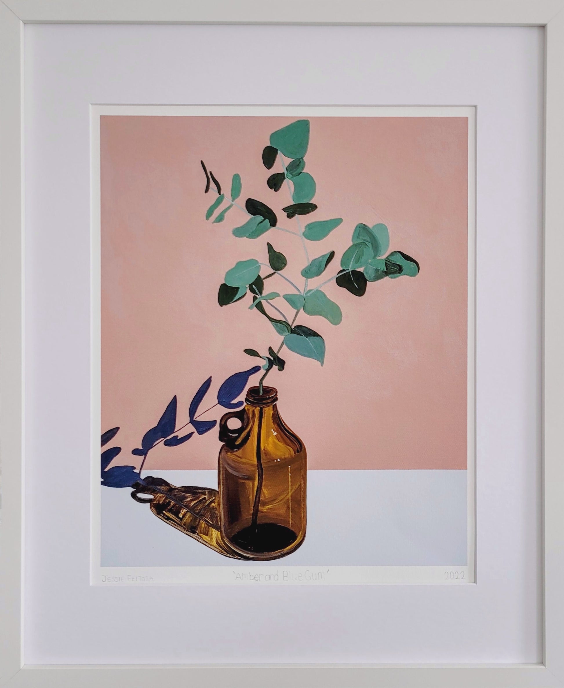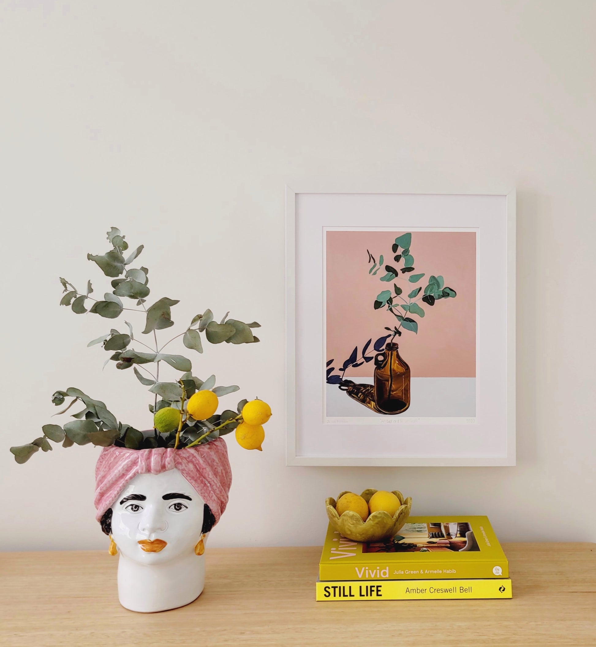 This print has a beautiful peachy pink background, amber glass bottle vase with a small branch of eucalyptus and lovely shadow work.