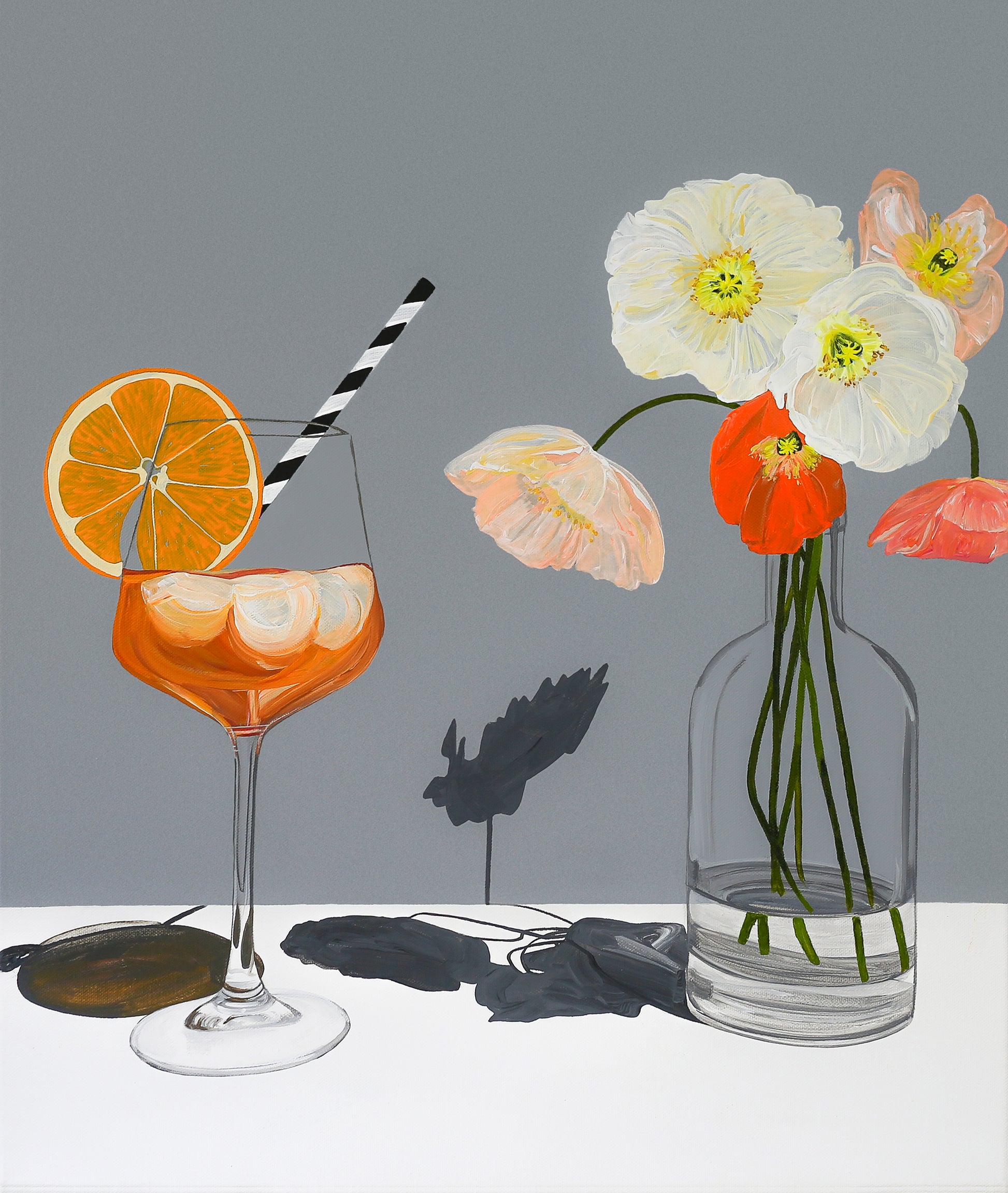 This print has a light grey background. A glass of Aperol Spritz, the vibrant orange cocktail really pops. Garnished with a slice of orange and a straw. Styled with fresh poppy flowers in a glass bottle vase.