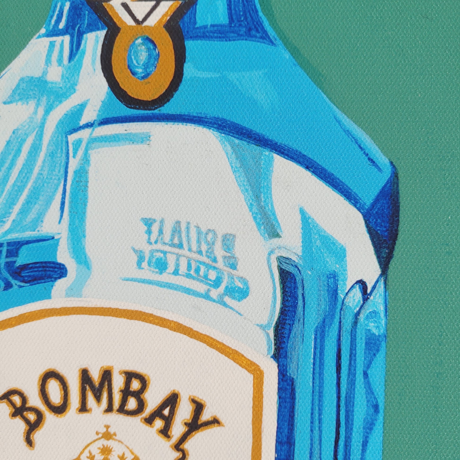 Vibrant background of green and blues. Bottle of bombay gin. A gin and tonic short glass with a charred lemon wedge on the edge and a sprig of fresh time.