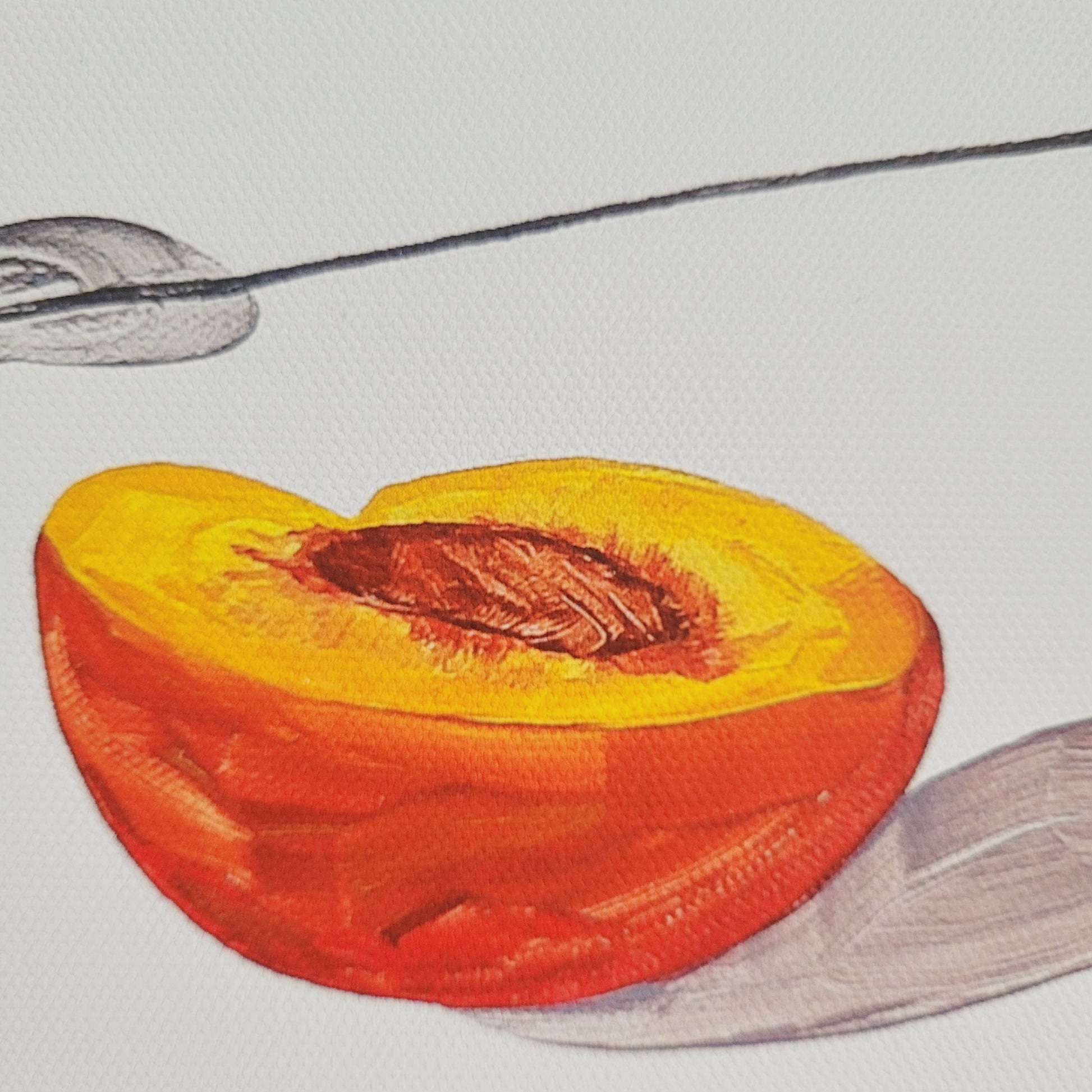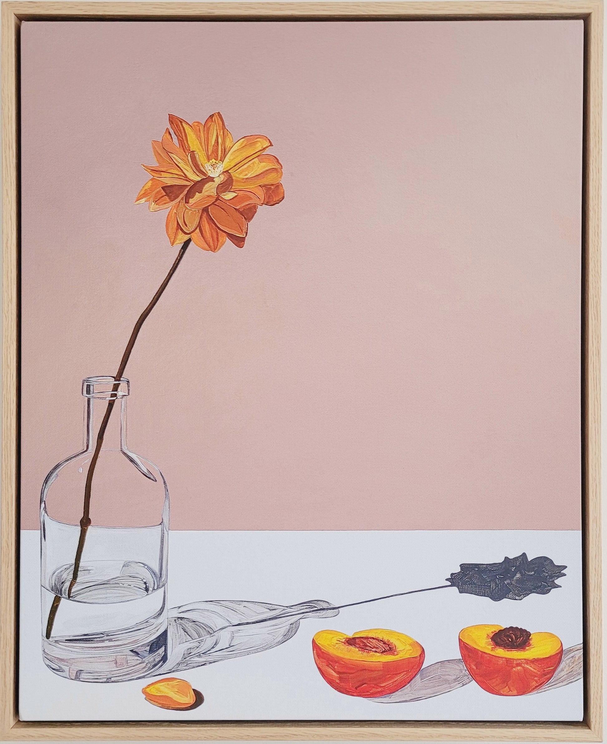 A beautiful peachy pink background, clear glass bottle vase with one orange flower, a fallen pedal on the foreground, a peach cut in half.