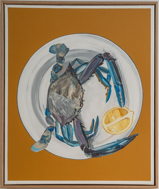 In this painting, the lemon is not just a mere fruit, but a symbol of vitality and zest for life. The bright yellow of the lemon and rich ochre background are a stark juxtaposition to the cool tones of the crab, yet together, create a harmonious balance that is pleasing to the eye.