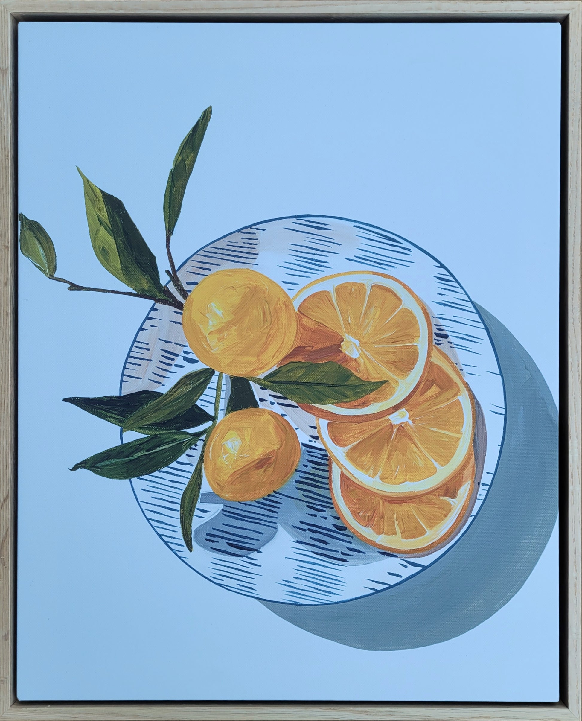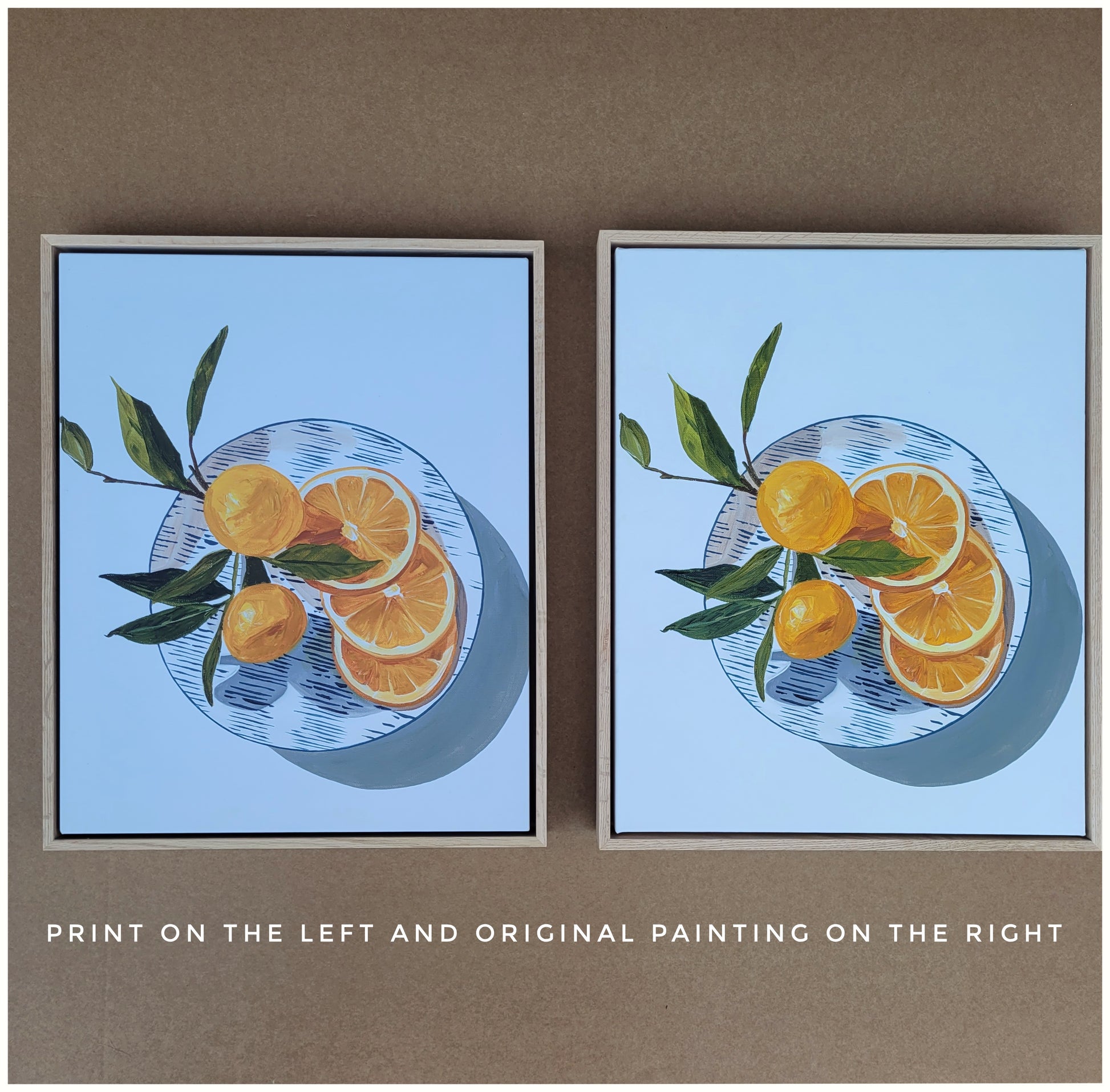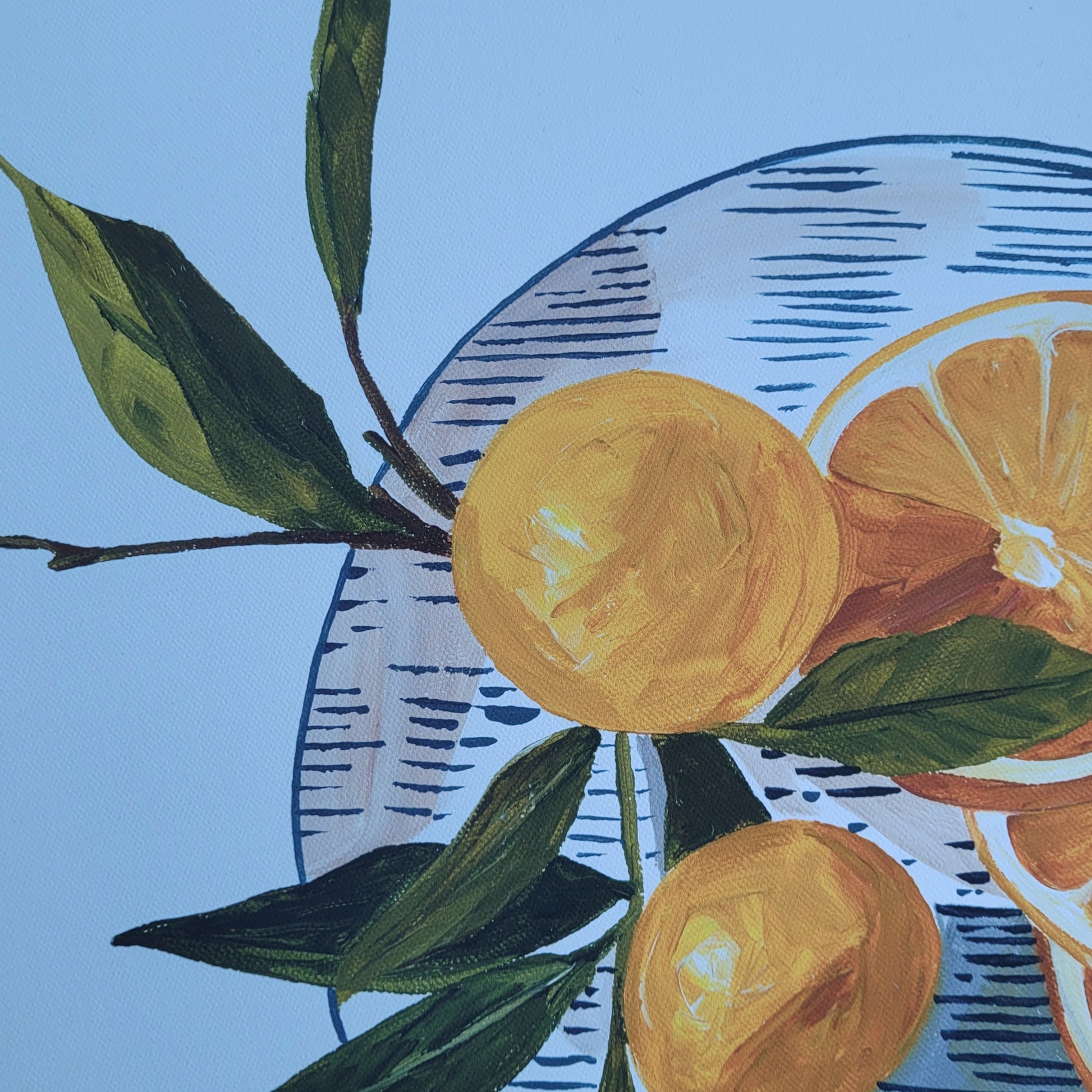 This print has a white background, a small blue and white stripped plate with fresh oranges with branches and leaves.