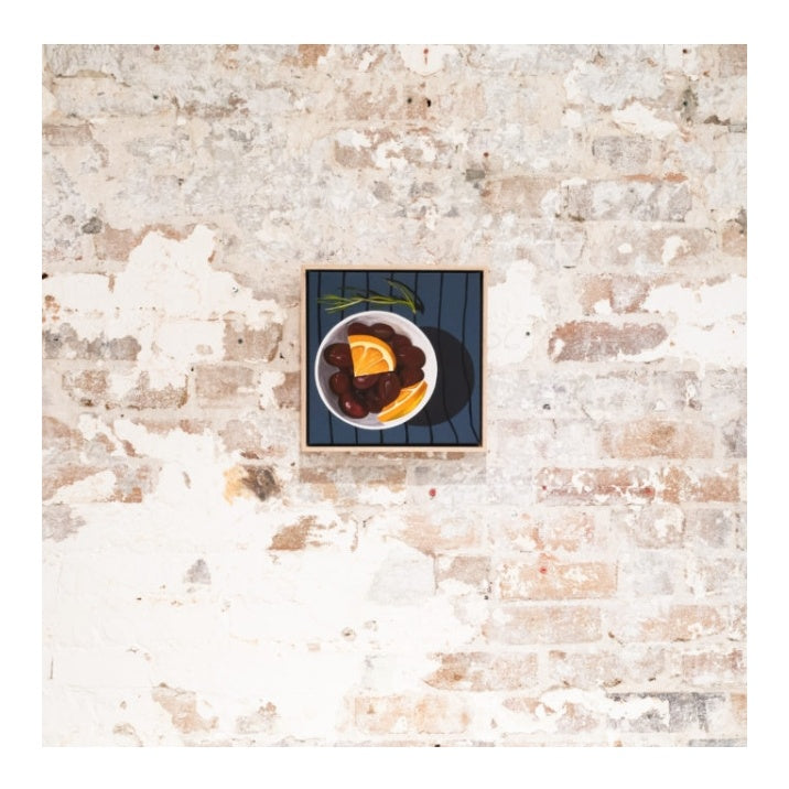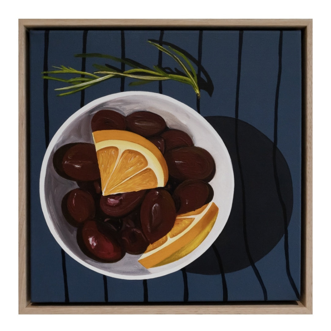 A sweet mini of a painting to style on a shelf or in the kitchen. The saturation of the kalamata olives and the contrasting blue tablecloth really create a wow factor impact in this small painting.