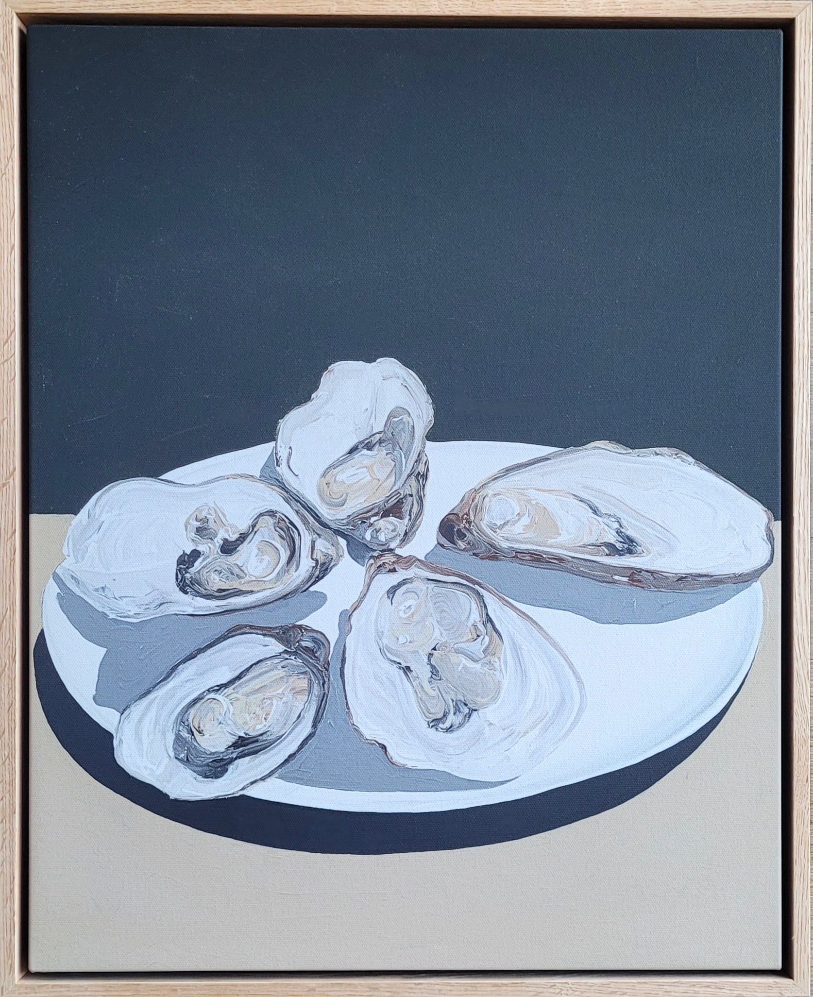 This print has a dark olive green and a nude sand background. A white plate of oysters.