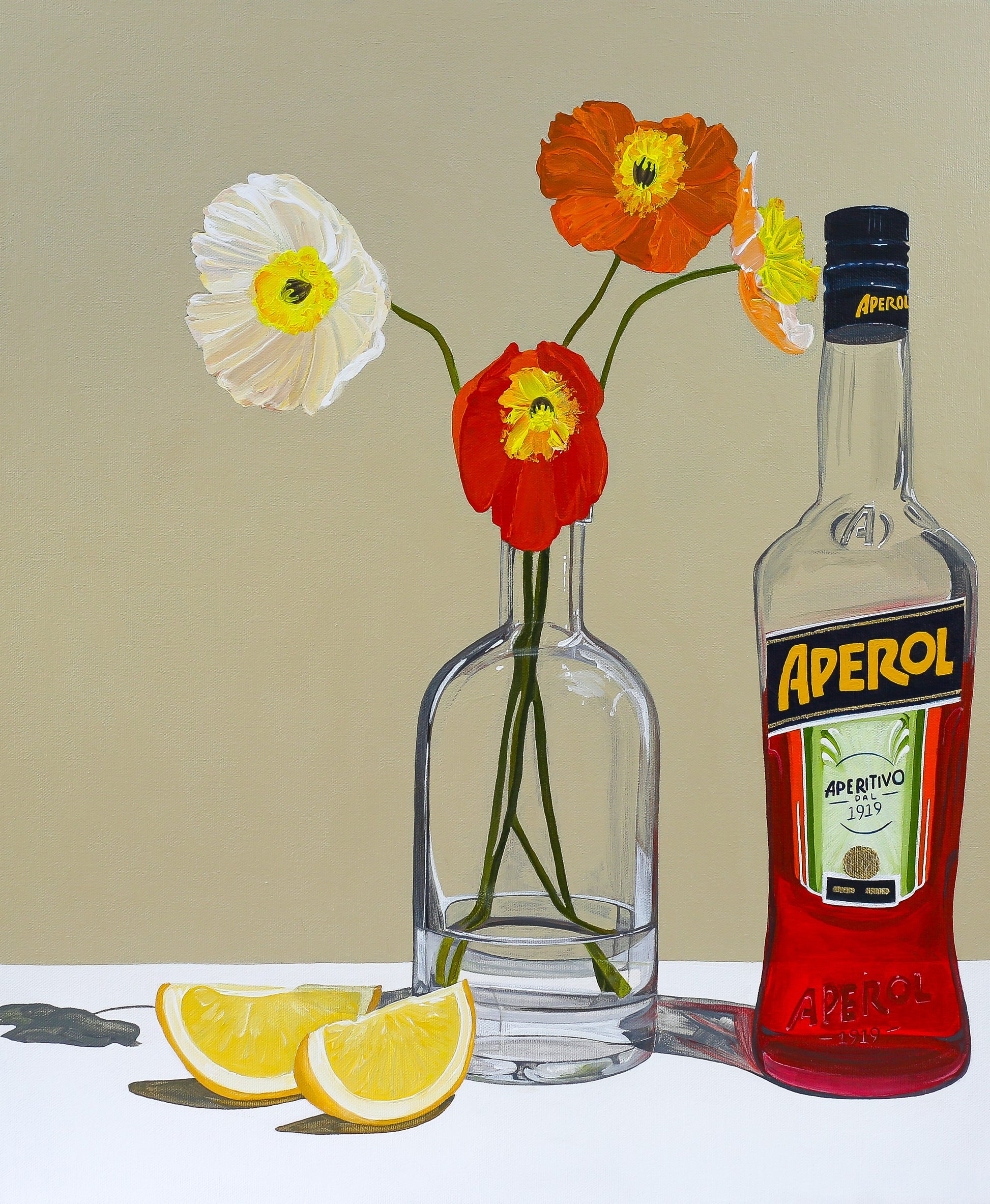 This print has a light nude sand background, a glass bottle vase, four vibrant coloured poppies, a bottle of aperol spritz and lemon wedges on the foreground.